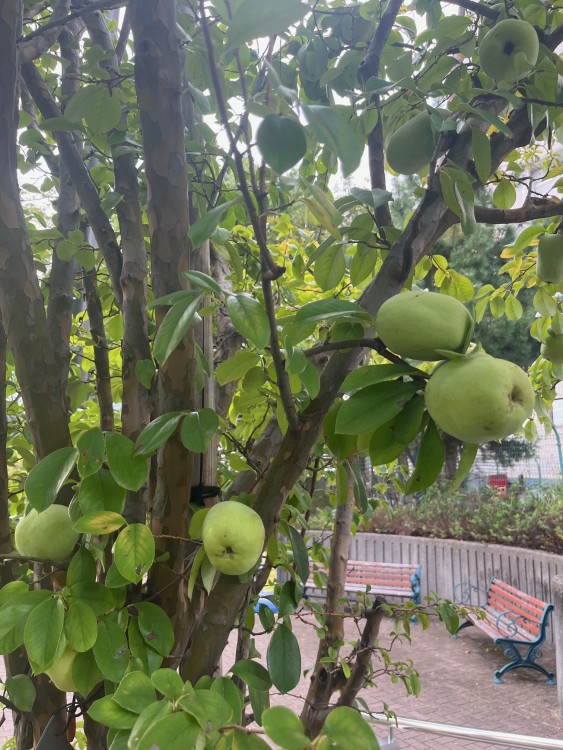 左には病院内の散歩道を載せました。朝夕4周(1周230m)ずつ歩くのですが、途中で花梨の木を見つけました。たくさん実ってました(左下)。これ採ってリキュールに漬けたら、良い去痰薬になりますよ。